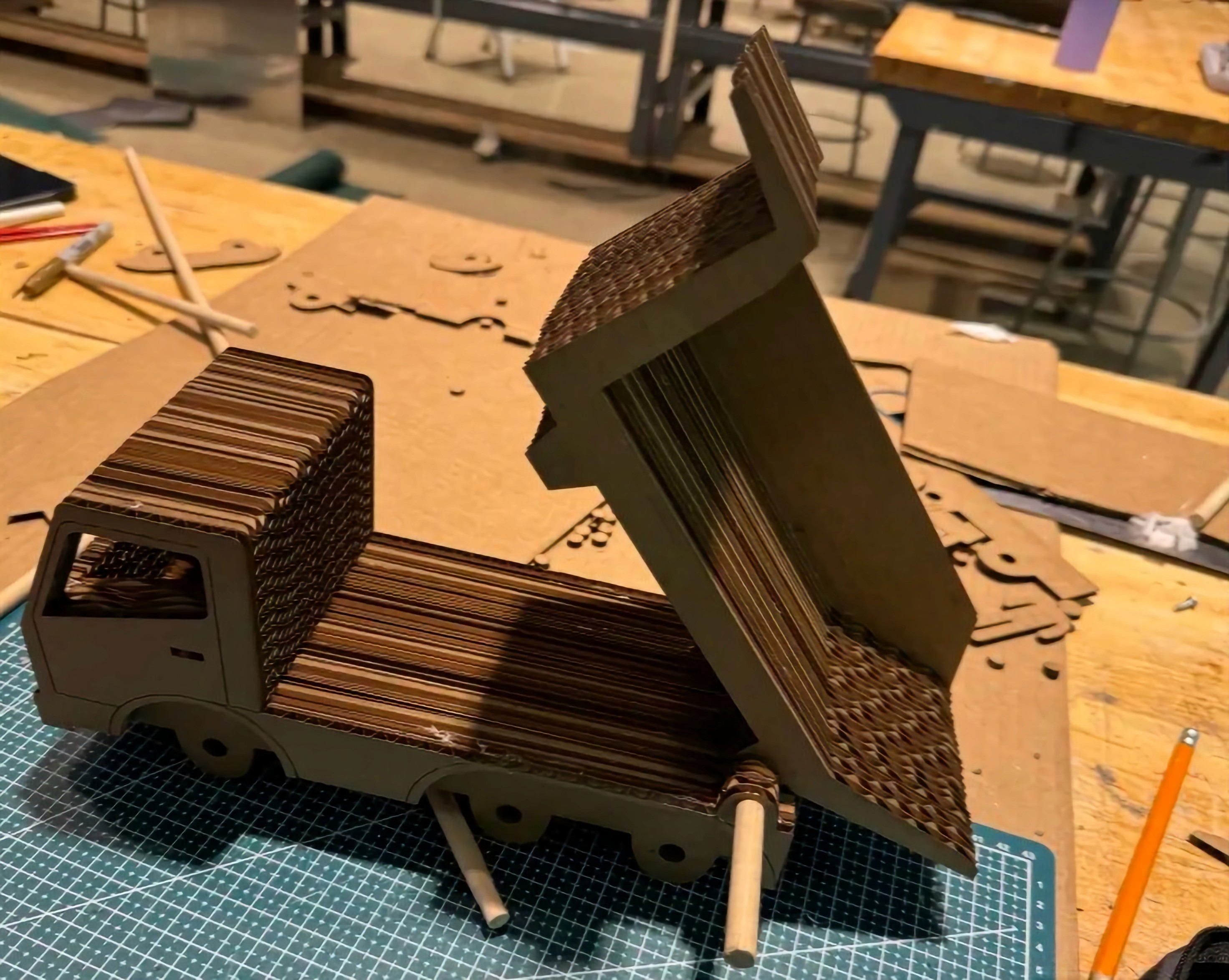I wanted to prove that it would be possible to replace nearly any plastic toy with a more sustainable cardboard option, so I challenged myself to make something that went beyond just a static model. This truck moves just as a plastic version in the market would.